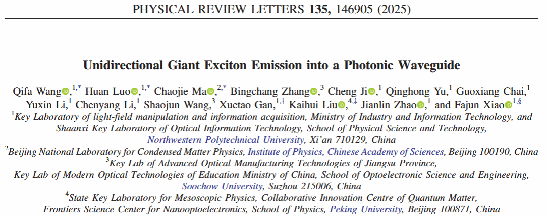 赵建林教授团队联合北京大学刘开辉教授、中国科学院物理研究所马超杰副研究员和苏州大学张丙昌、王绍军教授,在物理学领域顶级期刊《Physical Review Letters》上发表了题为“Unidirectional Giant Exciton Emission into a Photonic Waveguide”的研究论文。性吧