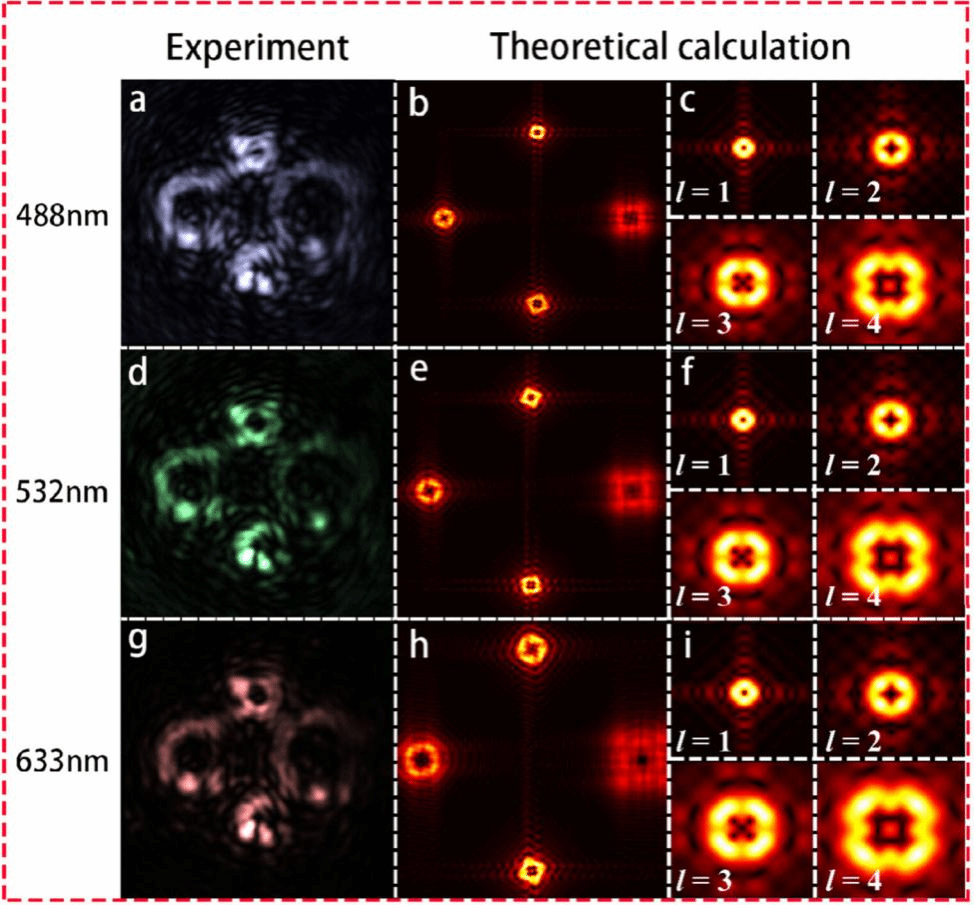 在488、532、633纳米不同波长照射下,本工作构筑的二氧化钛超表面器件在离焦平面均能产生清晰的四光点远场分布,且光点位置随波长增加而外扩。理论计算与实验结果一致,展示了器件在多波长下保持四通道轨道角动量生成能力。不同波长下各通道焦平面的光强分布显示光束特征图案保持稳定,虽有色散引起的轮廓展宽,但剖面相似性高。实验还发现拓扑电荷数越大对应通道亮度越强。这些结果证明了基于几何相位的设计具有固有宽带优势,保障了器件在实际应用中的可靠性。